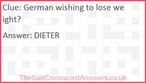 German wishing to lose weight? is a crossword clue for which we have 1 possible answer and we have spotted 2 times in our database. This crossword clue was last seen on 26 October 2023 in The Sun Cryptic Crossword puzzle!
