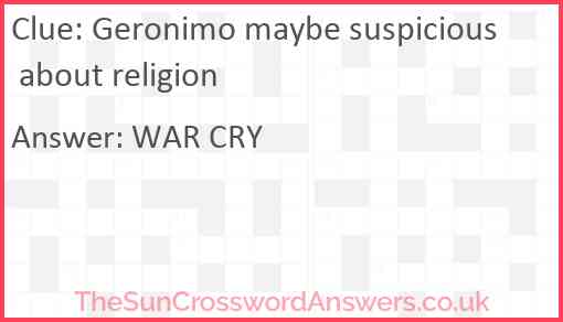 Geronimo maybe suspicious about religion is a crossword clue for which we have 2 possible answer and we have spotted 2 times in our database. This crossword clue was last seen on 12 November 2023 in The Sun Cryptic Crossword puzzle!