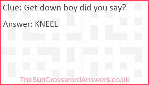 Get down boy did you say? is a crossword clue for which we have 1 possible answer and we have spotted 1 times in our database. This crossword clue was last seen on 01 January 2024 in The Sun Cryptic Crossword puzzle!