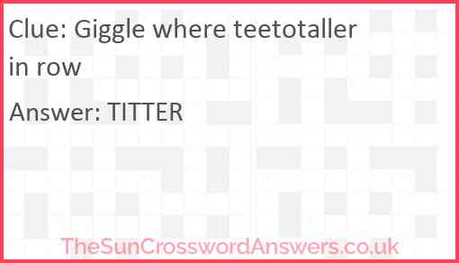 Giggle where teetotaller in row is a crossword clue for which we have 1 possible answer and we have spotted 3 times in our database. This crossword clue was last seen on 07 September 2023 in The Sun Cryptic Crossword puzzle!