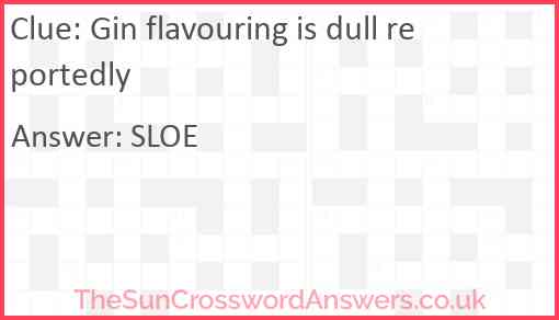 Gin flavouring is dull reportedly is a crossword clue for which we have 1 possible answer and we have spotted 2 times in our database. This crossword clue was last seen on 19 January 2024 in The Sun Cryptic Crossword puzzle!