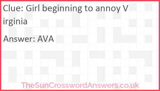Girl beginning to annoy Virginia is a crossword clue for which we have 1 possible answer and we have spotted 1 times in our database. This crossword clue was last seen on 11 April 2024 in The Sun Cryptic Crossword puzzle!