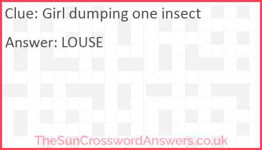 Girl dumping one insect is a crossword clue for which we have 1 possible answer and we have spotted 4 times in our database. This crossword clue was last seen on 08 February 2025 in The Sun Cryptic Crossword puzzle!