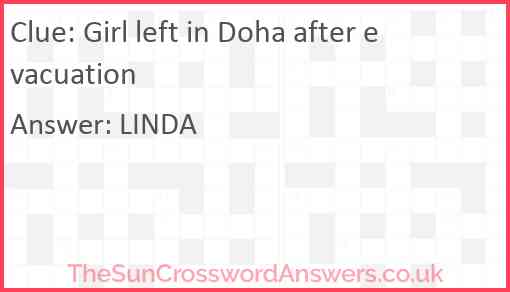 Girl left in Doha after evacuation is a crossword clue for which we have 1 possible answer and we have spotted 1 times in our database. This crossword clue was last seen on 07 February 2021 in The Sun Cryptic Crossword puzzle!