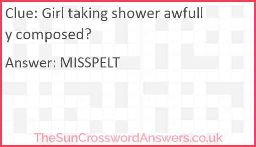 Girl taking shower awfully composed? is a crossword clue for which we have 1 possible answer and we have spotted 1 times in our database. This crossword clue was last seen on 02 February 2024 in The Sun Cryptic Crossword puzzle!