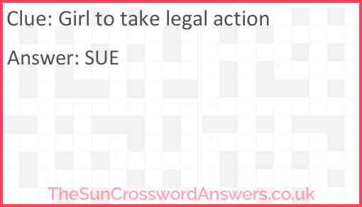 Girl to take legal action is a crossword clue for which we have 1 possible answer and we have spotted 3 times in our database. This crossword clue was last seen on 10 February 2024 in The Sun Cryptic Crossword puzzle!