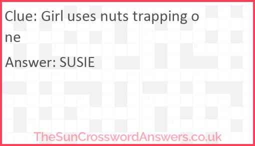 Girl uses nuts trapping one is a crossword clue for which we have 1 possible answer and we have spotted 1 times in our database. This crossword clue was last seen on 30 October 2024 in The Sun Cryptic Crossword puzzle!