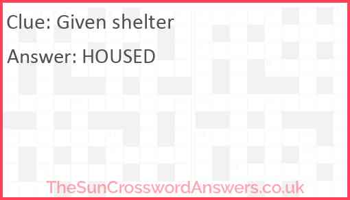 Given shelter is a crossword clue for which we have 1 possible answer and we have spotted 1 times in our database. This crossword clue was last seen on 22 July 2020 in The Sun Coffee Time Crossword puzzle!
