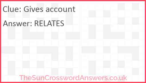 Gives account is a crossword clue for which we have 1 possible answer and we have spotted 1 times in our database. This crossword clue was last seen on 06 July 2024 in The Sun Coffee Time Crossword puzzle!