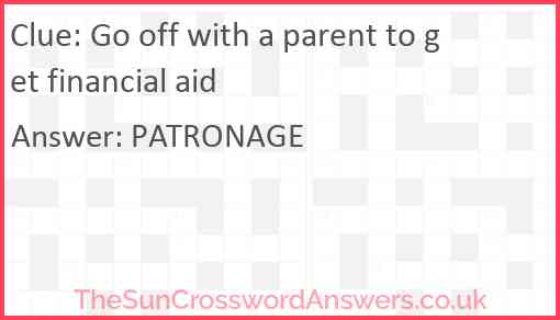 Go off with a parent to get financial aid is a crossword clue for which we have 1 possible answer and we have spotted 1 times in our database. This crossword clue was last seen on 17 September 2023 in The Sun Cryptic Crossword puzzle!