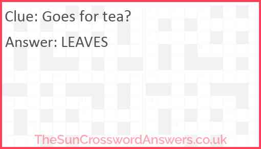 Goes for tea? is a crossword clue for which we have 1 possible answer and we have spotted 1 times in our database. This crossword clue was last seen on 31 December 2024 in The Sun Cryptic Crossword puzzle!