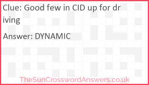 Good few in CID up for driving is a crossword clue for which we have 1 possible answer and we have spotted 1 times in our database. This crossword clue was last seen on 14 December 2023 in The Sun Cryptic Crossword puzzle!