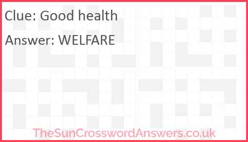 Good health is a crossword clue for which we have 1 possible answer and we have spotted 1 times in our database. This crossword clue was last seen on 04 March 2019 in The Sun Coffee Time Crossword puzzle!