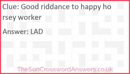Good riddance to happy horsey worker is a crossword clue for which we have 1 possible answer and we have spotted 2 times in our database. This crossword clue was last seen on 08 February 2024 in The Sun Cryptic Crossword puzzle!