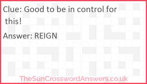 Good to be in control for this! is a crossword clue for which we have 1 possible answer and we have spotted 1 times in our database. This crossword clue was last seen on 19 January 2024 in The Sun Cryptic Crossword puzzle!