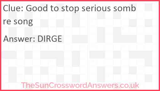 Good to stop serious sombre song is a crossword clue for which we have 1 possible answer and we have spotted 3 times in our database. This crossword clue was last seen on 21 August 2023 in The Sun Cryptic Crossword puzzle!