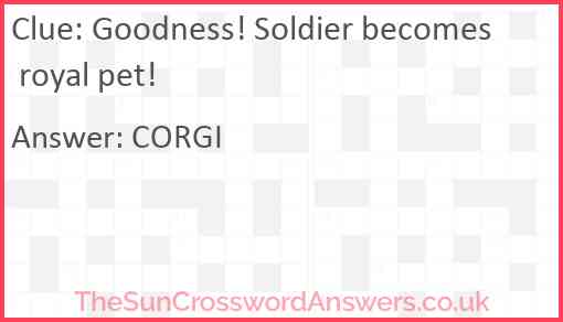 Goodness! Soldier becomes royal pet! is a crossword clue for which we have 1 possible answer and we have spotted 1 times in our database. This crossword clue was last seen on 30 March 2024 in The Sun Cryptic Crossword puzzle!