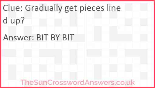 Gradually get pieces lined up? is a crossword clue for which we have 2 possible answer and we have spotted 2 times in our database. This crossword clue was last seen on 27 January 2023 in The Sun Cryptic Crossword puzzle!