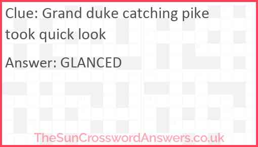 Grand duke catching pike took quick look is a crossword clue for which we have 1 possible answer and we have spotted 1 times in our database. This crossword clue was last seen on 14 March 2022 in The Sun Cryptic Crossword puzzle!