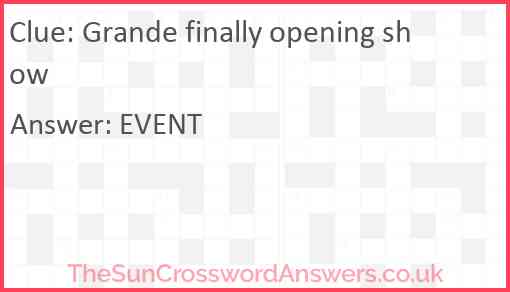 Grande finally opening show is a crossword clue for which we have 1 possible answer and we have spotted 1 times in our database. This crossword clue was last seen on 21 November 2024 in The Sun Cryptic Crossword puzzle!