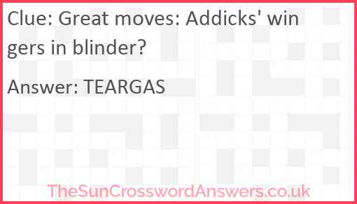 Great moves: Addicks' wingers in blinder? is a crossword clue for which we have 1 possible answer and we have spotted 1 times in our database. This crossword clue was last seen on 14 May 2023 in The Sun Cryptic Crossword puzzle!
