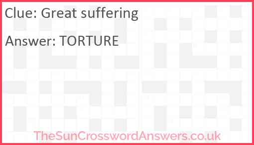 Great suffering is a crossword clue for which we have 1 possible answer and we have spotted 2 times in our database. This crossword clue was last seen on 09 January 2023 in The Sun Coffee Time Crossword puzzle!