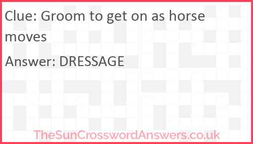 Groom to get on as horse moves is a crossword clue for which we have 1 possible answer and we have spotted 2 times in our database. This crossword clue was last seen on 06 September 2024 in The Sun Cryptic Crossword puzzle!