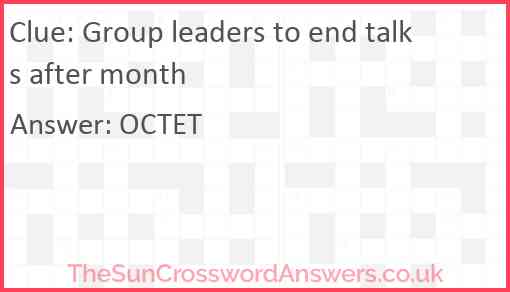 Group leaders to end talks after month is a crossword clue for which we have 1 possible answer and we have spotted 3 times in our database. This crossword clue was last seen on 24 February 2025 in The Sun Cryptic Crossword puzzle!