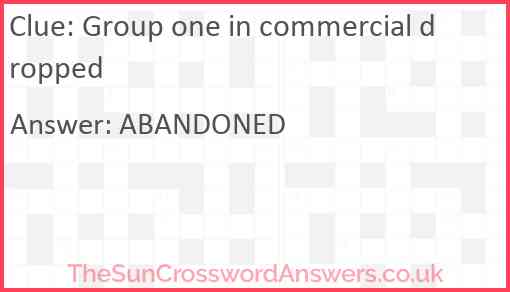 Group one in commercial dropped is a crossword clue for which we have 1 possible answer and we have spotted 5 times in our database. This crossword clue was last seen on 15 February 2025 in The Sun Cryptic Crossword puzzle!