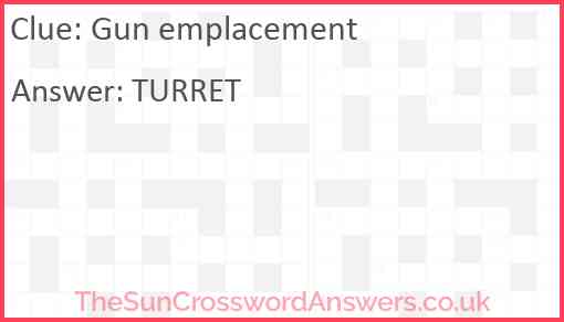 Gun emplacement is a crossword clue for which we have 1 possible answer and we have spotted 1 times in our database. This crossword clue was last seen on 05 April 2019 in The Sun Coffee Time Crossword puzzle!