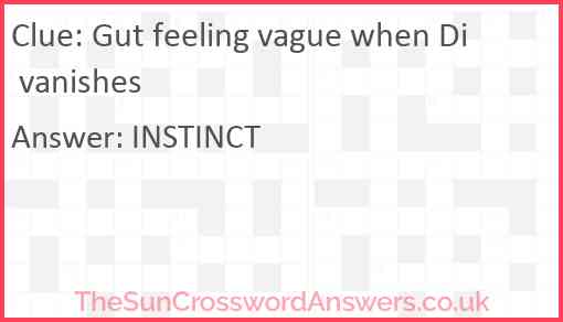 Gut feeling vague when Di vanishes is a crossword clue for which we have 1 possible answer and we have spotted 2 times in our database. This crossword clue was last seen on 01 October 2024 in The Sun Cryptic Crossword puzzle!