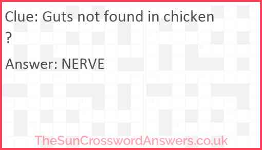 Guts not found in chicken? is a crossword clue for which we have 1 possible answer and we have spotted 4 times in our database. This crossword clue was last seen on 11 February 2025 in The Sun Cryptic Crossword puzzle!