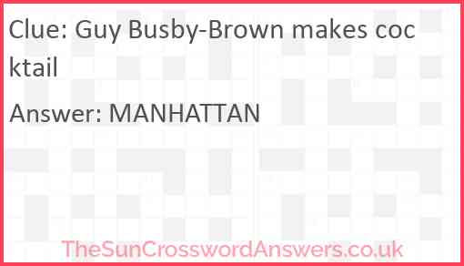 Guy Busby-Brown makes cocktail is a crossword clue for which we have 1 possible answer and we have spotted 1 times in our database. This crossword clue was last seen on 26 November 2022 in The Sun Cryptic Crossword puzzle!