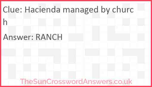 Hacienda managed by church is a crossword clue for which we have 1 possible answer and we have spotted 4 times in our database. This crossword clue was last seen on 03 September 2023 in The Sun Cryptic Crossword puzzle!