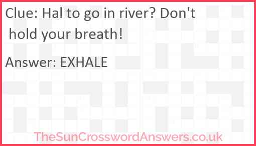 Hal to go in river? Don't hold your breath! is a crossword clue for which we have 1 possible answer and we have spotted 2 times in our database. This crossword clue was last seen on 11 March 2023 in The Sun Cryptic Crossword puzzle!