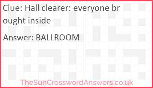 Hall clearer: everyone brought inside is a crossword clue for which we have 1 possible answer and we have spotted 2 times in our database. This crossword clue was last seen on 20 October 2023 in The Sun Cryptic Crossword puzzle!