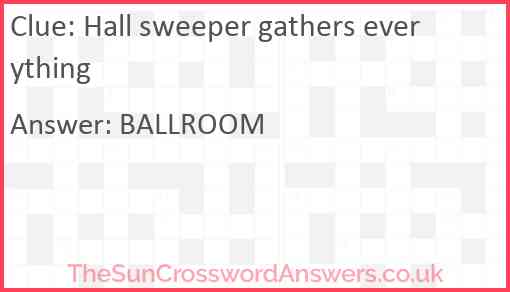 Hall sweeper gathers everything is a crossword clue for which we have 1 possible answer and we have spotted 3 times in our database. This crossword clue was last seen on 12 July 2024 in The Sun Cryptic Crossword puzzle!