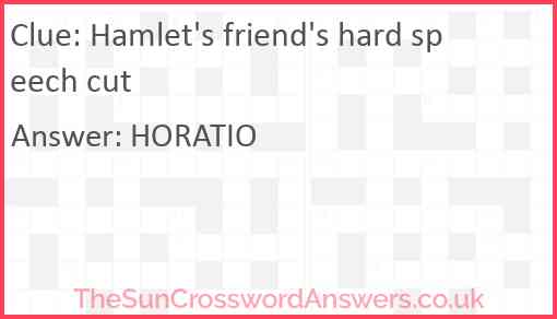 Hamlet's friend's hard speech cut is a crossword clue for which we have 1 possible answer and we have spotted 2 times in our database. This crossword clue was last seen on 03 July 2023 in The Sun Cryptic Crossword puzzle!