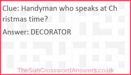Handyman who speaks at Christmas time? is a crossword clue for which we have 1 possible answer and we have spotted 2 times in our database. This crossword clue was last seen on 14 September 2022 in The Sun Cryptic Crossword puzzle!