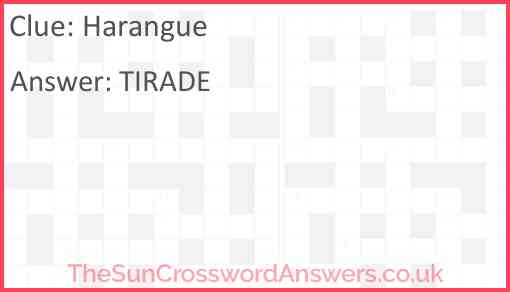 Harangue is a crossword clue for which we have 3 possible answer and we have spotted 20 times in our database. This crossword clue was last seen on 22 May 2025 in The Sun Coffee Time Crossword puzzle!
