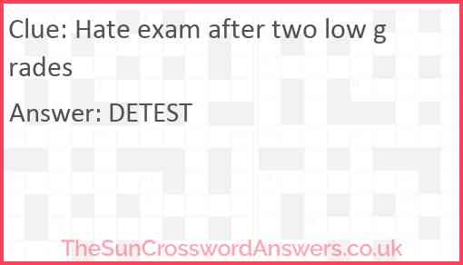 Hate exam after two low grades is a crossword clue for which we have 1 possible answer and we have spotted 3 times in our database. This crossword clue was last seen on 20 March 2025 in The Sun Cryptic Crossword puzzle!