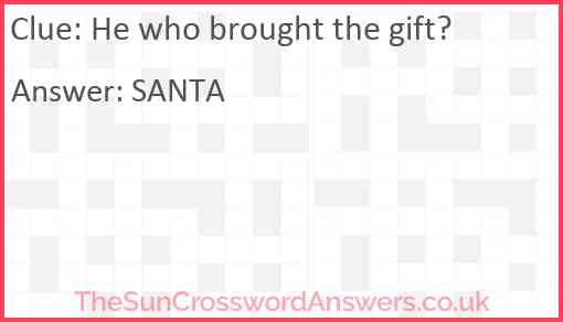 He who brought the gift? is a crossword clue for which we have 1 possible answer and we have spotted 1 times in our database. This crossword clue was last seen on 25 December 2023 in The Sun Coffee Time Crossword puzzle!