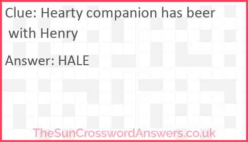 Hearty companion has beer with Henry is a crossword clue for which we have 1 possible answer and we have spotted 2 times in our database. This crossword clue was last seen on 27 October 2024 in The Sun Cryptic Crossword puzzle!