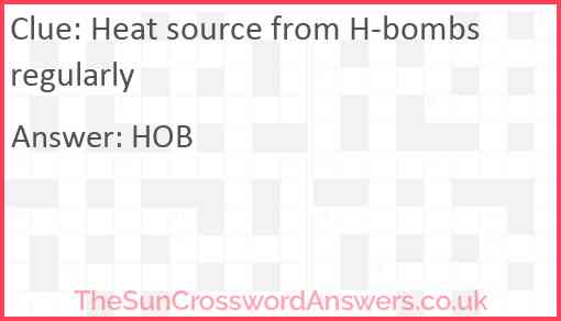 Heat source from H-bombs regularly is a crossword clue for which we have 1 possible answer and we have spotted 1 times in our database. This crossword clue was last seen on 25 May 2023 in The Sun Cryptic Crossword puzzle!