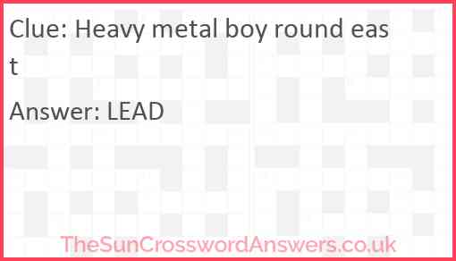 Heavy metal boy round east is a crossword clue for which we have 1 possible answer and we have spotted 1 times in our database. This crossword clue was last seen on 06 December 2019 in The Sun Cryptic Crossword puzzle!