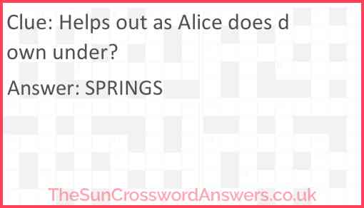 Helps out as Alice does down under? is a crossword clue for which we have 1 possible answer and we have spotted 2 times in our database. This crossword clue was last seen on 24 March 2024 in The Sun Cryptic Crossword puzzle!