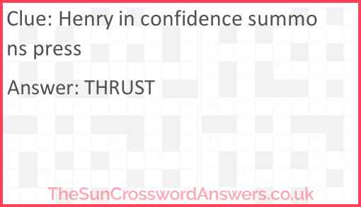Henry in confidence summons press is a crossword clue for which we have 1 possible answer and we have spotted 3 times in our database. This crossword clue was last seen on 07 February 2024 in The Sun Cryptic Crossword puzzle!