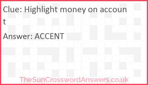 Highlight money on account is a crossword clue for which we have 1 possible answer and we have spotted 2 times in our database. This crossword clue was last seen on 07 August 2023 in The Sun Cryptic Crossword puzzle!