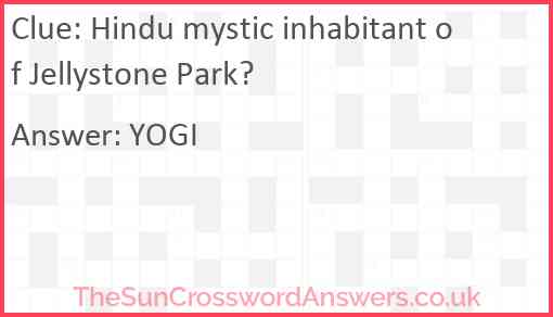 Hindu mystic inhabitant of Jellystone Park? is a crossword clue for which we have 1 possible answer and we have spotted 1 times in our database. This crossword clue was last seen on 09 January 2019 in The Sun Cryptic Crossword puzzle!
