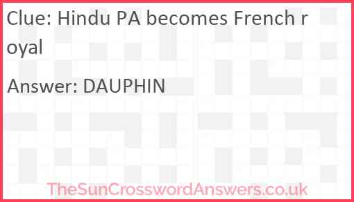 Hindu PA becomes French royal is a crossword clue for which we have 1 possible answer and we have spotted 1 times in our database. This crossword clue was last seen on 24 February 2022 in The Sun Cryptic Crossword puzzle!